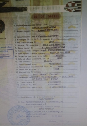 6Х6, двускатная ошиновка, г/п 22 т., КПП ZF16, п/о главной передачи 5,14, двускатная ошиновка, 1 спальное место, а/ш 12.00R20, бак 500 л., ТСУ (высота ССУ при полной / снаряженной массе) 1550/1590, МКБ, МОБ, дв. КАМАЗ-740.632-400 (E-4), топл. ап. BOSCH, Common Rail, мосты Daimler, РК КАМАЗ-6522, КОМ с насосом, шины "Север", отоп. Планар, ДЗК, диаметр шкворня 2", пневмоподв. каб., тахограф российского стандарта с блоком СКЗИ [Continental DTCO 3283]